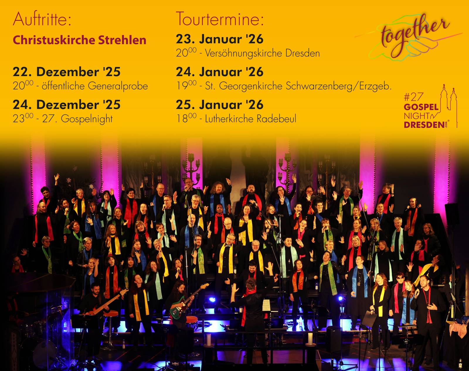 Geleitet und organisiert wird das gesamte Projekt durch ein vierzehnköpfiges Vorbereitungsteam. Bei der Durchführung der Gospelchristvesper und den Gottesdiensten im Januar arbeiten dann eine Menge weiterer ehrenamtlicher Mitarbeiter in verschiedenen Teams (Sicherheits-, Küchen- und Technikteam) mit, welche vor allem bei den Aufführungen auf bis zu 45 Personen anwächst. Wem das Singen also nicht so liegt, kann auch gerne auf anderen Wegen aktiv bei der Gospelnight Dresden mitwirken und eine unvergessliche Saison in Gemeinschaft erleben.